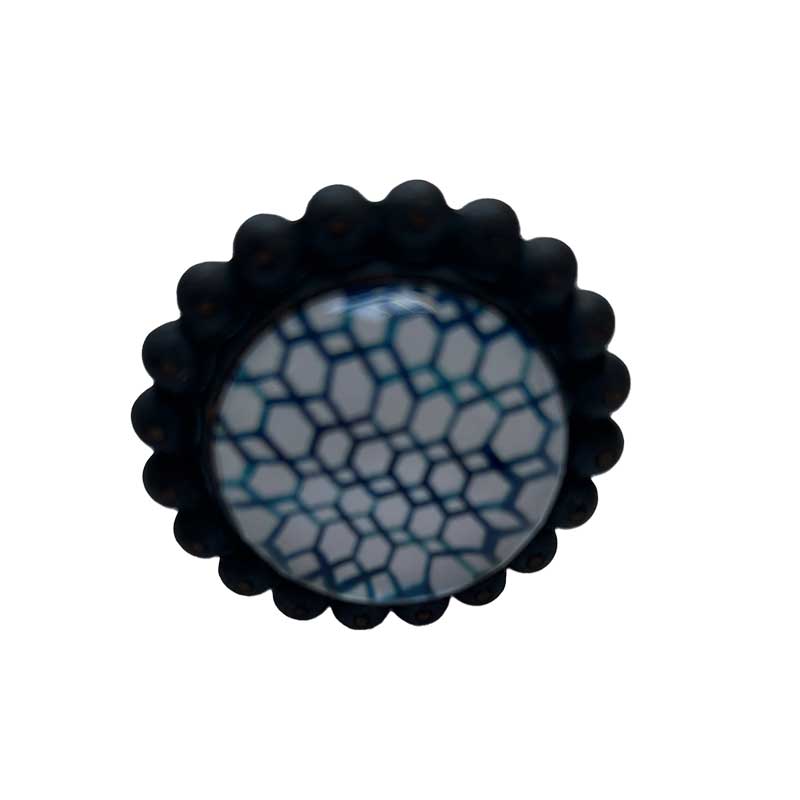 Dessus verre décoré à dominante bleue, motifs assortis soit alvéole, quadrillage ou volutes.