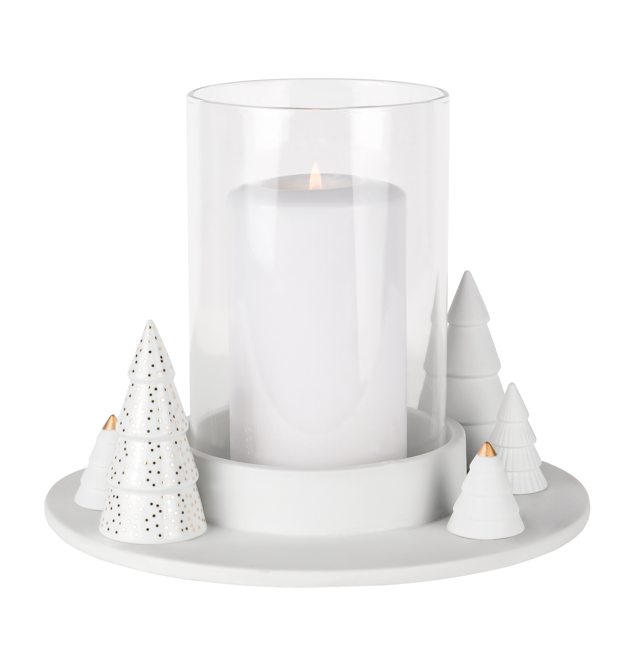 Le socle est une miniature de sous-bois, décoré de six sapins en porcelaine blanche immaculée. Quatre d’entre eux sont délicatement rehaussés d’une touche d’or fin, apportant une note d’éclat précieux et festif à l’ensemble.